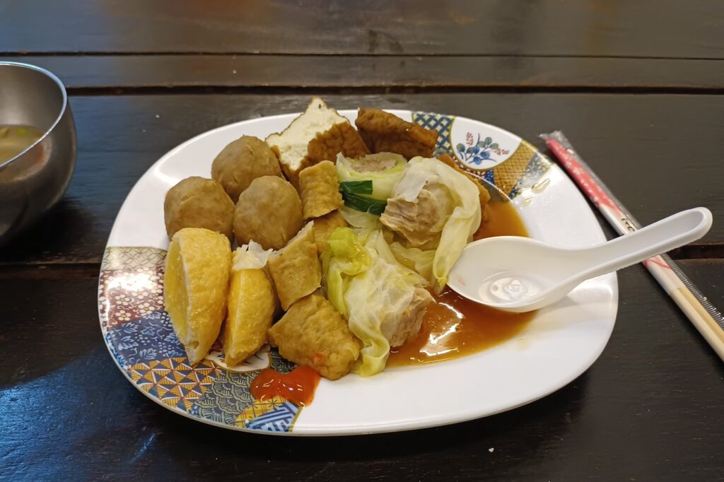 There was a small restaurant Shoushan A-Li Oden behind the hotel. The signboard reads O-lien in Chinese characters. I learned it means Oden, Japanese dish of stewed fried fish cakes and vegetables. It was brought to Taiwan from Japan during the Japanese rule. It has changed to suit the tast buds of local people and became one of their food culture now. In front of the restaurant, the owner was servicing to other customer. I was just watching how he is ordering. I finally mustered up the courage and pointed what I want by fingers. I ordered fish meatballs, Daikon raddish, cabbage roll of fish cake, atsuage fried tofu, a fried tofu pouch of boild egg etc. The owner of the restaurant chopped them to a bite size and served them in a plate. There are tables and chairs at the back of the restaurant. I ate them at the table. They all tasted good. It was interesting to me that they eat with condiment tastes like chilly sauce. I would like Japanese hot mustard. I found some Oden restaurants in the streets of Hamasen. I found Oden among various dishes at the breakfast hall of the Holiday inn express Taipei.
